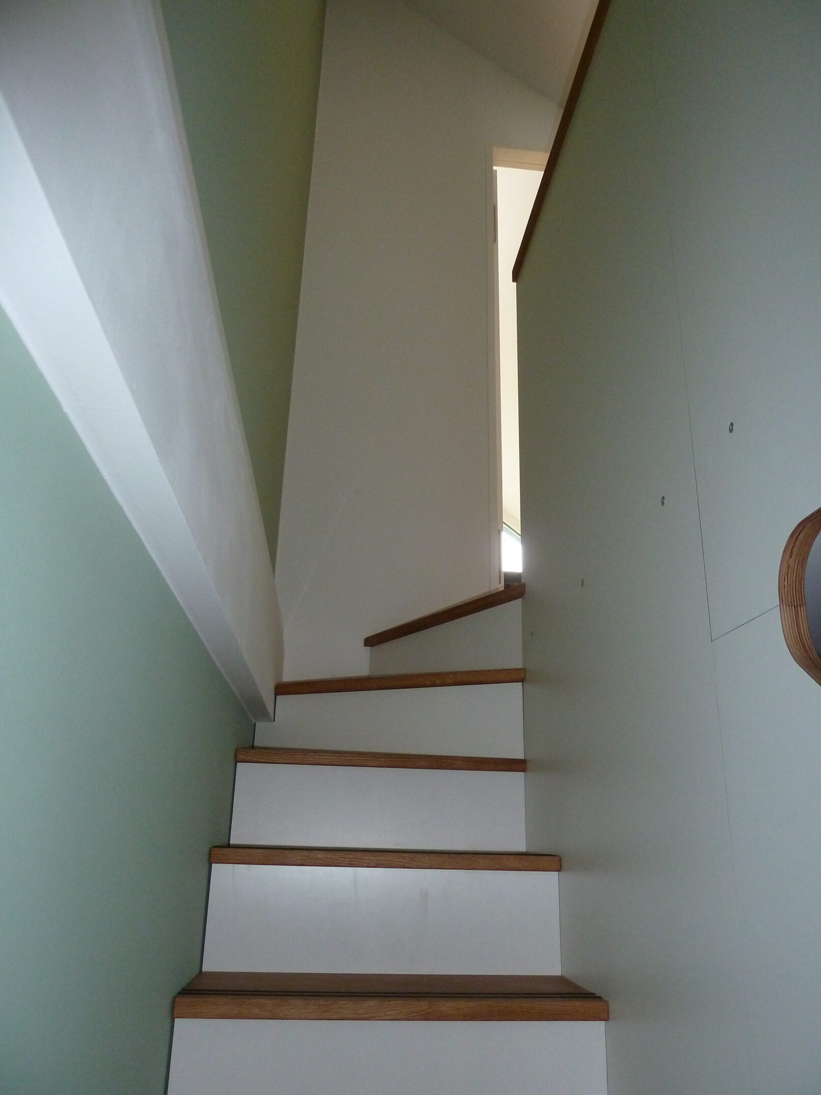 Zehn Jahre später wurde die zur Bauzeit bereits angedachte Photovoltaikanlage auf dem Dach samt großem Batteriespeicher und Ladesäule realisiert. Mit der Zeit zeigte sich, dass die Fläche des Abstellraums im Dachgeschoss kleiner sein kann. Somit wurde gartenseitig ein kleiner Arbeitsraum und eine Diele davor abgetrennt. Für natürliches Licht und Luft ist die Holzverschalung des Giebels komplett zurück gebaut und durch ein raumhohes Fensterelement ersetzt worden. Der Raum ist über einen „Treppenschrank“ zugänglich, der in der bisherigen Garderobennische eingebaut und wofür die Decke darüber geöffnet wurde.