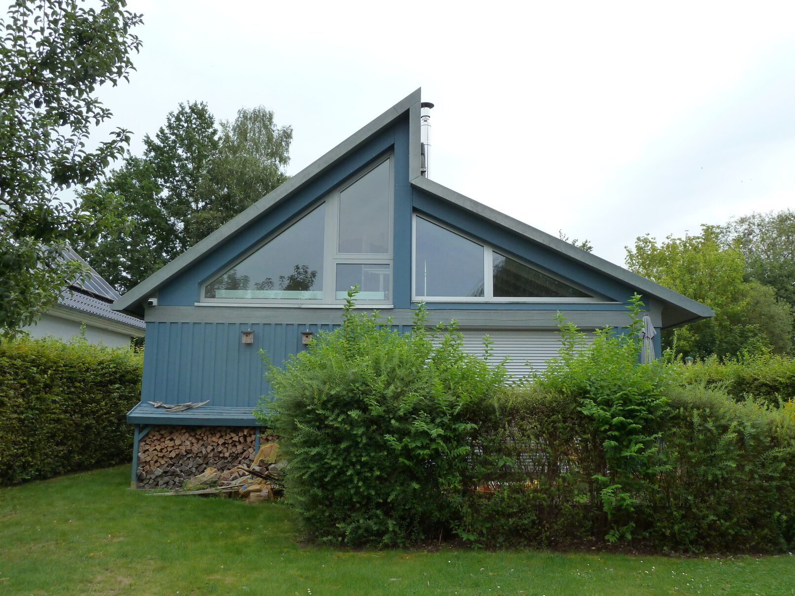 Auf Grund des hohen Grundwasserstands ist eine Luft-Wasser-Wärmepumpe im von außen zugänglichen Technikraum untergebracht mit Ansaugöffnung in der Giebelwand und Abluft über Dach.